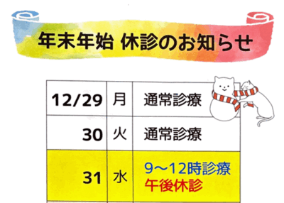 12/31(水)の診療受付は、9:00~12:00までとなります。 午後は休診とさせていただきま…