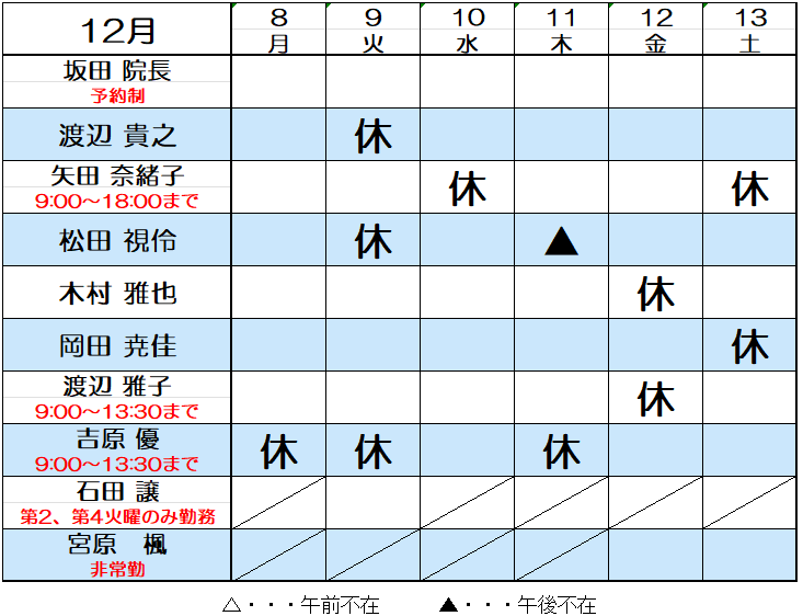 出勤日および不在時間は、予告なく変更になる場合があります。