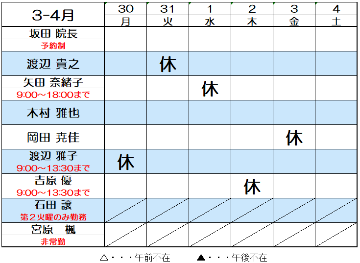 出勤日および不在時間は、予告なく変更になる場合があります。