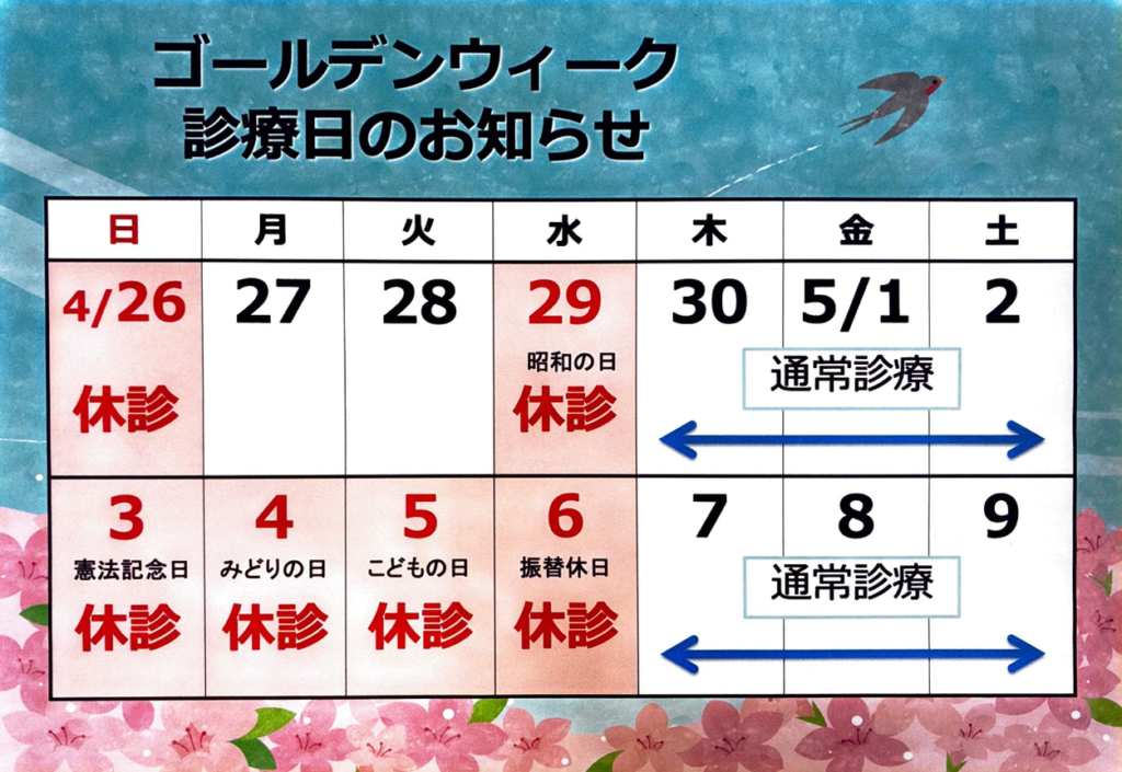 ゴールデンウイークの休診日のお知らせ お知らせ 2026.03.31 Tue 5月3日~5月6日は休診日となります。ご了承ください。 お薬やご飯をお買い求めの方は、お早めにご連絡いただきますよう、お願い致します。